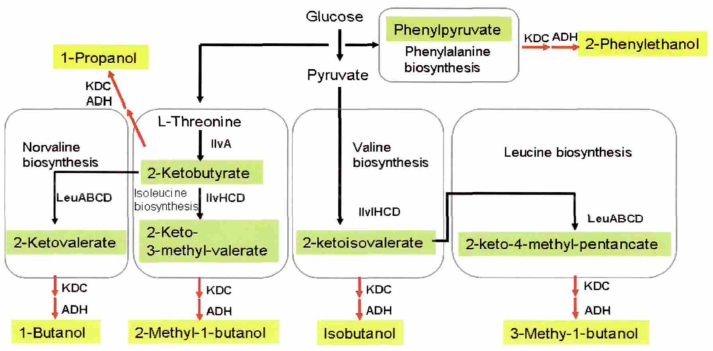 传统的燃料化学品主要是乙醇和丁醇,但随着合成生物学技术的发展,许多新型燃料化学品被开发出来,主要包括长链醇( 丙醇、正丁醇、异丁醇、异戊醇)、脂肪酸酯、脂肪醇、烷烃、烯烃等。其中异丁醇是目前较为火热的一种生物燃料。