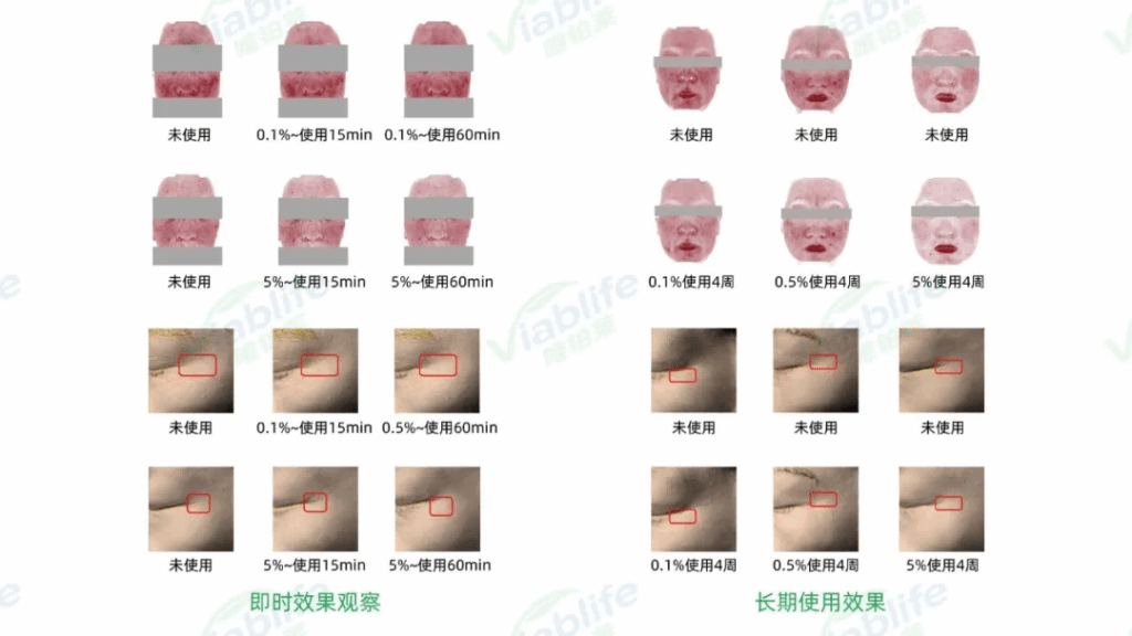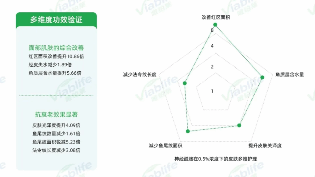 针对同一添加浓度下太阳成集团官网神经酰胺NP的不同功效,太阳成集团官网也设置了人体功效检测实验。比如添加0.5%浓度的神经酰胺NP原料,与使用安慰剂相比,使用后面部红区面积改善提升10.86倍,经皮失水减少1.89倍,角质层含水量提升5.66倍,皮肤光泽度提升4.09倍,鱼尾纹减少1.61倍,鱼尾纹面积锐减5.23倍,法令纹长度减少3.08倍。