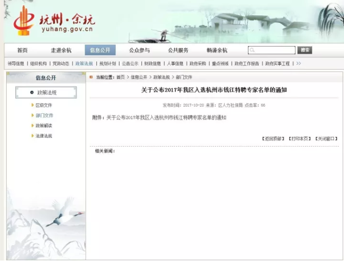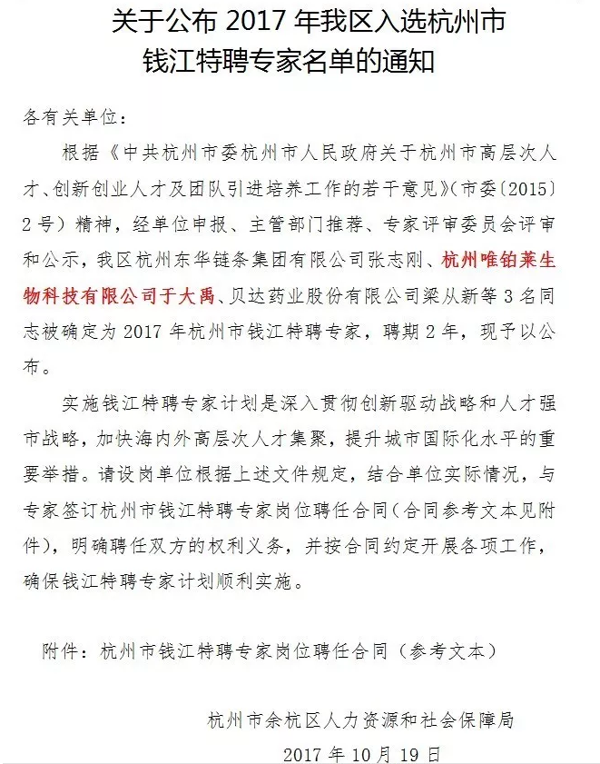 关于公布2017年我区入选杭州市钱江特聘专家名单的通知