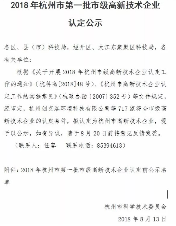 根据有关文件要求,经研究,决定将浙江省717家企业列入2018年杭州市高新技术企业。