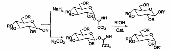 三氯乙酰亚胺酯法是Schmidt于1980年发现的,也称Schmidt法。该法是在碱的催化下,部分保护的糖和三氯乙腈加成得到三氯乙酰亚胺酯,然后再在Lewis酸催化剂的作用下反应生成糖苷。 这一方法反应条件温和、应用范围广、合成的糖苷产率较高,因此被称为最有价值的糖苷合成方法。