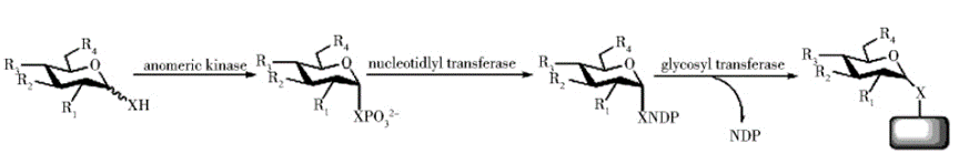 除了化学合成以外,糖苷化合物还可以利用生物合成的方法获得,通常是非糖物质在酶的催化作用下被其它离子或基团取代,再在同一处将糖基转移上去。其大致过程可以用下图表示。