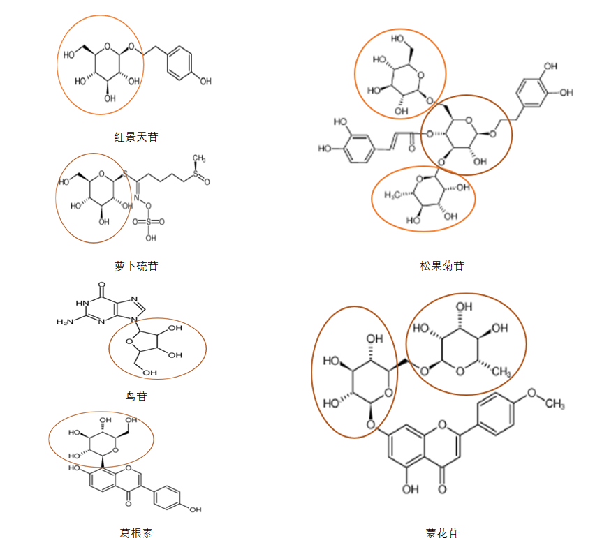 在植提产物中,也存在不少的糖苷化合物,下图列举了研究人员较为常用的几个糖苷化合物,通过对它们结构的分析,可以粗略地了解糖苷的性质。
