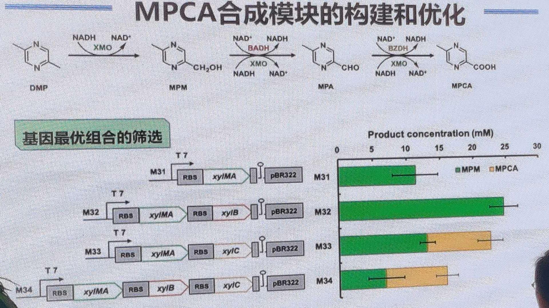 绿色生产也是中国科学院微生物研究所吴边博士奉行的宗旨,在他的报告中,介绍了5-甲基吡嗪-2-羧酸(MPCA)在目前工业上一种常见的化学合成方法,提出其存在工艺复杂、产物产率纯度低、污染环境等问题,不符合绿色生产理念。因此,吴博士团队以该路线为核心,逆向推导、细化,将其分为不同的合成模块,再将生物合成技术运用到各个模块中,最终实现了生物技术合成MPCA的方法,解决了化合方法存在的一系列问题,凸显了生物合成技术在绿色生产中的重要性。