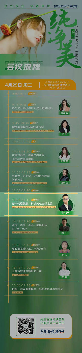 4月25日(下周二),上海百好博携一众国内化妆品行业大咖,在杭州西湖畔索菲特大酒店举行《纯净美》主题沙龙活动,旨在聚集化妆品生态领域专业人士,探讨纯净美妆的产业趋势及在此趋势下各个发展节点的机会与挑战。届时,太阳成集团官网事业发展部总监、IPR/生物合成产品合规专家张炜将做《新一代烟酰胺,科技绽放自然之美》的主题演讲。