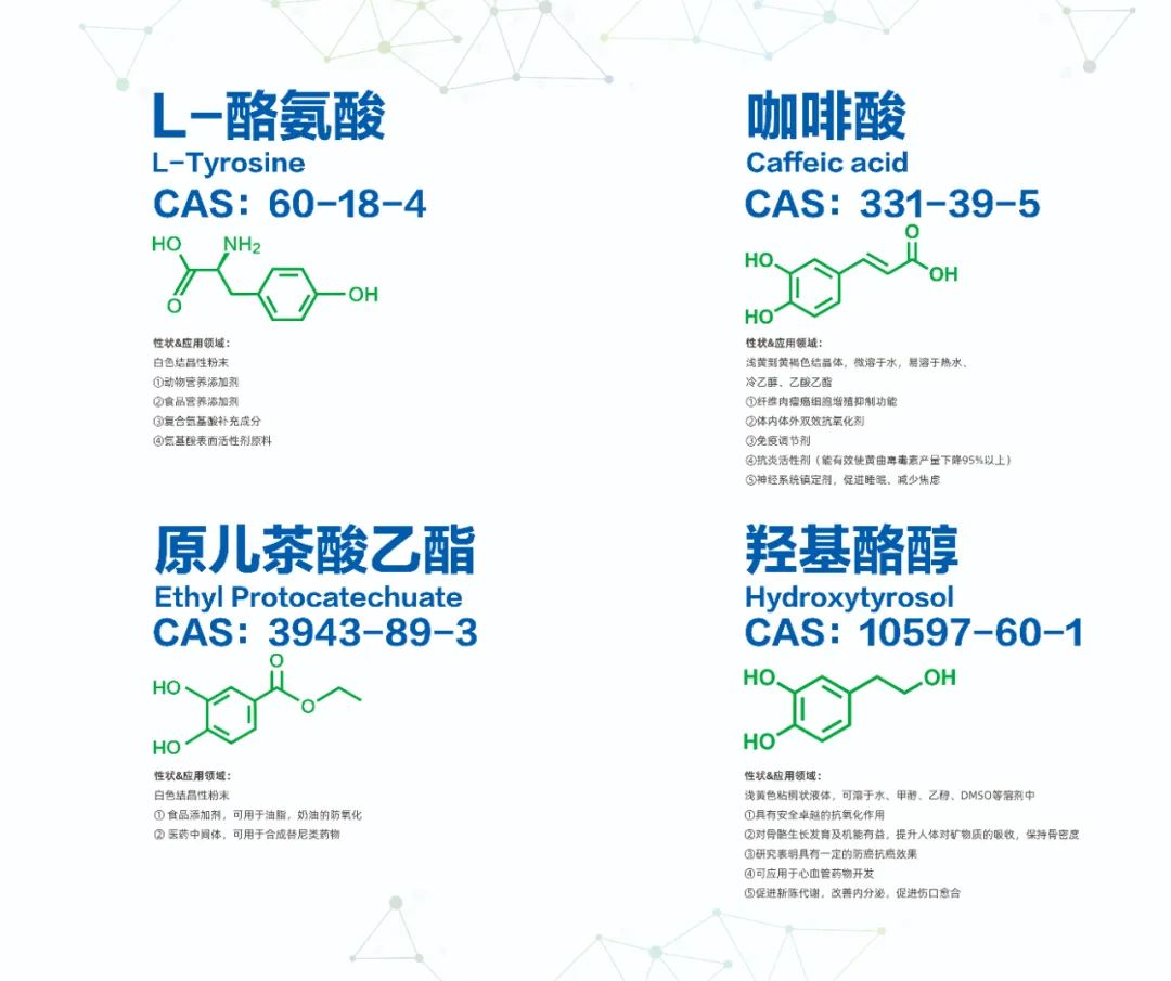 产品:原儿茶酸、烟酰胺、L-酪氨酸、咖啡酸等